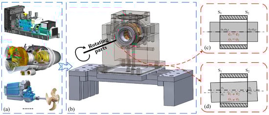 When the shaft journal is rotating, lubricating oil is drawn into the gap, which results in a certain dynamic pressure generated within the oil film. In the meantime, the oil volume in the wedge void will increase as the speed of the shaft journal increases. Once the speed of the shaft journal stabilizes, a stable oil film will completely separate the shaft journal from the bearing shell, which may eliminate mechanical contact and reduce surface wear. Figure 1a shows the usage examples of the HJB, and Figure 1b shows the general structure of the HJB. Ideal and non-ideal assembly states are shown in Figure 1c and Figure 1d, respectively.