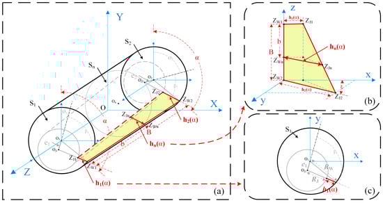 To determine the oil film thickness at the point () for any given cross-section () and any given Angle (), the coordinate system () is constructed with as the origin, while the line () coincides with the -axis, as illustrated in Figure 2b. The angle between and can be expressed as the Equation (4).