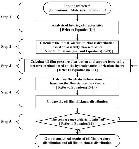 In this section, an iterative solution method is proposed for addressing the problem of Fluid–Solid coupling analysis with various assembly characteristics, such as stator axis translation, stator axis rotation, and stator axis misalignment, based on hydrodynamic lubrication theory and Hertzian deformation theory. Figure 6 illustrates the process of solving the Fluid–Solid coupling model of the HJB.