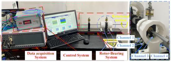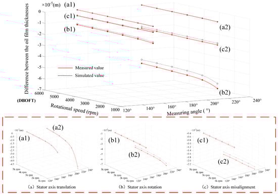 In the operational state of stator axis rotation, eccentric distances (, ) of shaft journal within the two designated cross-sections (, ) can be determined according to Equations (20) and (21).
