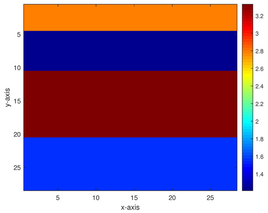 - Model 1. The first model is a level-stratified permeability model comprising three interfaces, and the permeability values from bottom to top are 1.55, 3.33, 1.21, and 2.80 as shown in Figure 3. For the addition of 40 dB, 30 dB, 20 dB, and 10 dB Gaussian noises (which are generated by the function AWGN in MATLAB) to the measurement data, the inversion results of the multigrid method with constraint data and the multigrid method without constraint data are respectively displayed in Figure 4 and Figure 5.