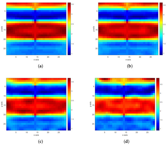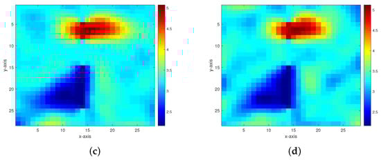 Figure 7. Inversion results of the permeability model in Figure 6 from the multigrid method with constraint data. (a–d) The respective inversion results with 40 dB, 30 dB, 20 dB, and 10 dB Gaussian noises added.