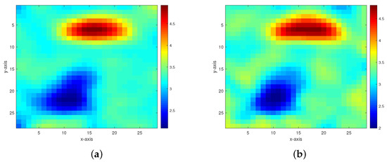 Figure 5. Inversion results of the permeability model in Figure 3 from the multigrid method without constraint data. (a,b) The respective inversion results with 40 dB and 30 dB Gaussian noises added. - Model 2. The second model as shown in Figure 6 is composed of two anomalous bodies embedded into a homogeneous background. The background permeability value is 3.25. The permeability values of the two anomalous bodies are 4.95 and 2.18. Figure 7 and Figure 8 respectively display the inversion results of the multigrid method with constraint data and the multigrid method without constraint data, with 40 dB, 30 dB, 20 dB, and 10 dB Gaussian noises added.