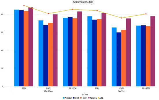 The results of all the neural network models’ trials using Word2Vec and FastText methods with the dataset in 5- and 3-class configurations are shown in Table 2 and Figure 10 and Figure 11. This was carried out in order to assess how well the various neural network models performed in relation to the two-word embedding methods and class configurations.