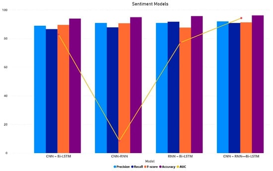 According to the information provided in Table 2, our study demonstrates that all ensemble models exhibit superior performance compared to their individual neural network counterparts. Specifically, the CNN-RNN-Bi-LSTM model achieved the highest accuracy rate of 96.2%, along with an F-score of 91.3%. It is worth noting that this trend aligns with previous research findings, which have consistently shown that multimodal techniques tend to outperform individual models, regardless of the datasets used [40,41].