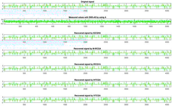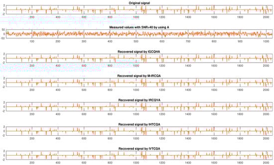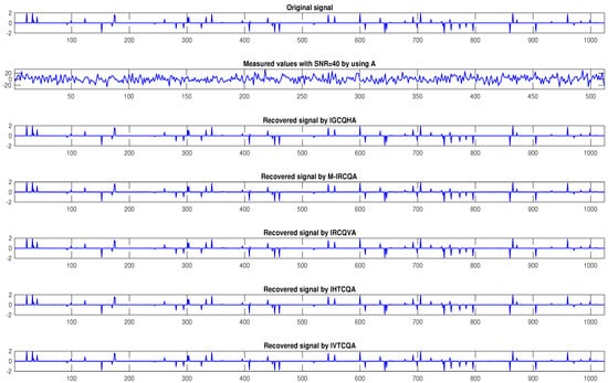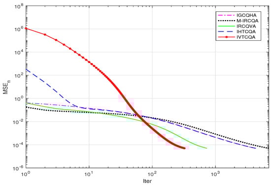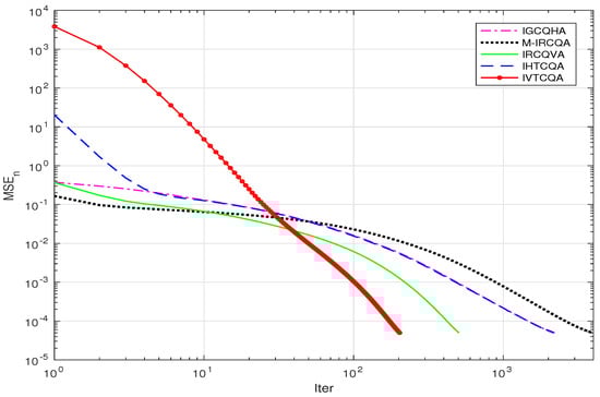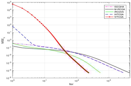 For the experiments, we evaluate the performances of five algorithms in solving problem (33): (1) IGCQHA, (2) M-IRCQA, (3) IRCQVA, (4) IHTCQA, and our purposed algorithm (5) IVTCQA. For algorithms (1–4), the parameters were selected based on experiments from [,,,], respectively. For algorithm (5), we conducted multiple experiments using various sets of parameters and selected the set that performed the best.