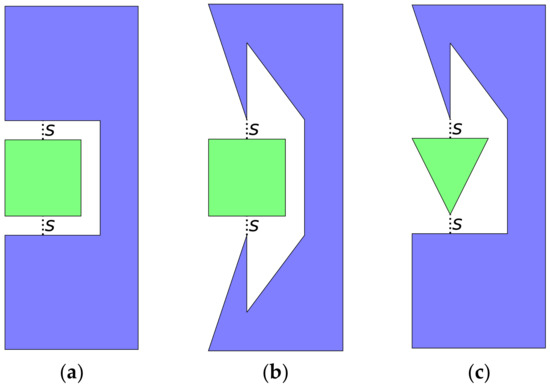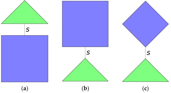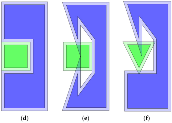 It is worth noting that considering the separation constraint is not equivalent to enlarging the items to be packed. This misconception is common in some industries. While there are cases where it might be true, when dealing with pieces with sharp edges, enlarging items may imply a larger separation between pieces than the desired one. Figure 2a–c illustrate cases where an edge-to-vertex separation (), as considered in this study, is achieved. In scenarios where the approach is to increase the size of the pieces, each edge moves away by half the desired separation (). Figure 2d shows a case where this separation is appropriate and achieves the same effect as considering the edge-to-vertex separation. However, Figure 2e,f demonstrate cases where this strategy of enlarging the pieces would not be appropriate because there would be overlap between the enlarged pieces. This situation occurs because, by considering a separation () between the edges of the original and the enlarged piece, some vertices would be at a distance greater than () from the corresponding vertices. As seen in Figure 2e,f, this phenomenon is more evident when the internal angle between the edges of a piece is smaller.