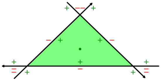 Positive and negative sides of the lines associated with the edges of a convex polygon.