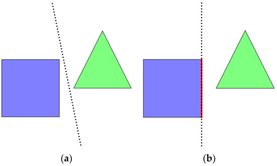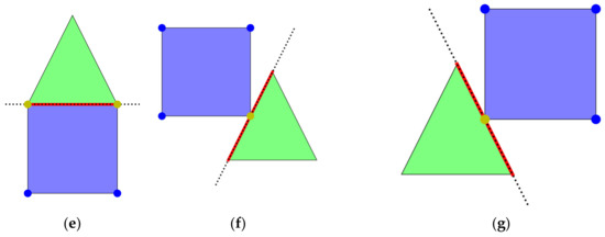 Two convex polygons are separated if all vertices of the first polygon lay on one line’s side and all vertices of the second polygon lay on the other line’s side. In this study, the edges are oriented such that all vertices of the same polygon are on the positive edges’ side. Therefore, if an arbitrary point lies on the positive side of all polygon edges, it is on the polygon. Otherwise, if the arbitrary point lies on the negative side of at least one polygon edge, it is outside the polygon. Moreover, the non-overlapping constraint allows touching; therefore, the vertices of both polygons can be colinear to the separating line (Figure 5).