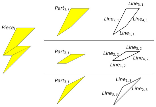 The basic formulation for the NDTM considers no rotation for the pieces. This model consists of a set of pieces , each piece has a subset of convex parts (sub-polygons) , and each part has a subset of lines (see Figure 6). The parameters and variables for the NDTM are shown in Table 1 and Table 2, respectively. Additionally, Figure 7 illustrates the notation of the parameters related to a piece listed in Table 2.