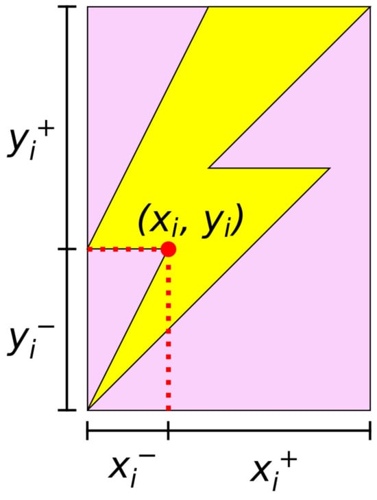 The D-function (Equation (1)) is used to identify the relative position of a point to an oriented line segment that starts at point and ends at point . If , is on the negative side of the line . If , is on the positive side of the line . If , is on the line .
