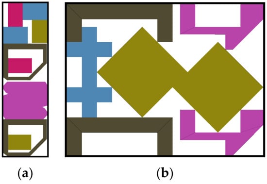 - Rodrigues, M.O. Irregular and Quasi-Polyomino Strip Packing Problems. Doctoral Thesis, Universidade de São Paulo, São Paulo, Brazil, 2020. [Google Scholar]