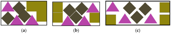 This study also incorporates the separation constraint, also known as the distance constraint, which mandates that at least a specified distance must separate the packed items within the container [8,9,10]. This constraint is related to the necessary space for cutting tools to extract the shapes once placed within the container. The separation between items depends on the material of the container from which pieces are extracted and the technology of the cutting tool. For example, wood may be cut with a saw and metal with a laser. Both materials/technologies require different separations among the items to extract them without altering their dimensions or shapes.