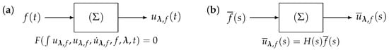 Let us symbolically denote the equation that governs the dynamics of in direct space (see Figure 1a). To simplify the presentation, we assume at this stage that the initial condition on is null: . Since the functional relationship is linear and has constant coefficients, the Laplace transformation can be applied to it. This gives the algebraic relationship , which governs the dynamics of in the Laplace space, where is the Laplace transfer function of the system (see Figure 1b), with and .