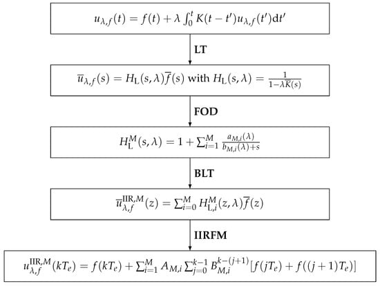 Main steps of the IIRFM, as applied to the numerical solution of linear CVIEs ( and ) of the second kind, with LT: Laplace transform; FOD: first-order partial fractions decomposition; BLT: bilinear transformation; IIRFM: final result of the IIRFM method.