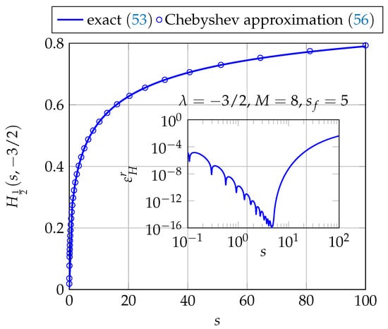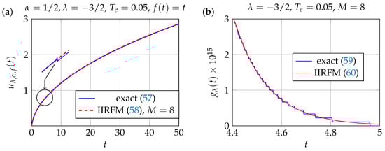 where the polylogarithm Li and transcendent Lerch functions were defined in Section 3.1.1. Using result (101) with , the following explicit expression is obtained for the IIRFM solution to the problem (99), at time (with ):