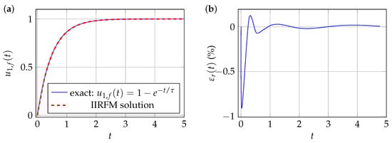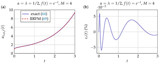 IIRFM resolution of Equation (2), considering a logarithmic kernel, with , , , , , and an interpolation interval . (a) Changes in the analytical and numerical solutions as a function of t. (b) Relative error in %.