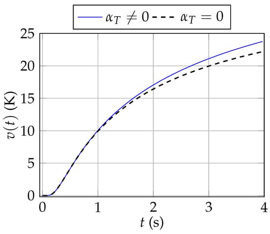 From the results shown in Figure 14, it can be seen that the temperature coefficient has a non-negligible influence on the time evolution of the source point temperature. When the influence of is taken into account, the self-heating of the source point leads to an increase in its electrical resistance (because is positive), and so at constant heating intensity, this leads to an increase in the Joule heating power and consequently in its temperature , compared to the situation where . These observations could be applied to various methods of the thermal characterization of materials.