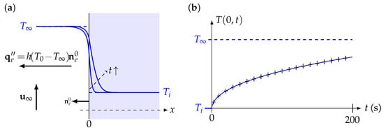 Temperature of a semi-infinite solid () with constant Robin boundary conditions at , due to a fluid flowing at constant velocity and temperature far from the solid, with constant Newton coefficient h. (a) Temperature profiles at different times, for . (b) Time evolution of the surface temperature when . The symbols correspond to the analytical solution (100) and the solid line to the numerical solution (102) obtained by the IIRFM method.
