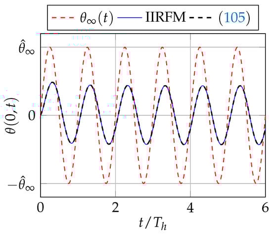 Figure 16 compares the numerical results (solid line) obtained by the IIRFM to the results provided (black dashes) by the analytical expression (105), when with and . The correspondence between the results provided by the IIRFM and the analytical solution is again very good, with maximum error K and root mean square error K, calculated for a sampling period .