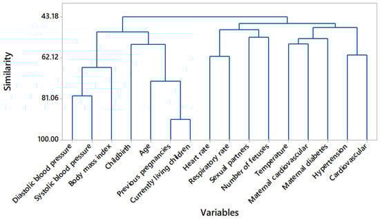 In Figure 1, a dendrogram is used to graphically observe the 16 features and their resemblance. Based on Figure 1, the state of the art and a description of each cluster is provided in Table 8. Previous and current live gestation are considered a single feature [25], as are heart rate and respiratory rate [26] and maternal cardiovascular and maternal diabetes [27]; thus, 13 characteristics are subtracted.