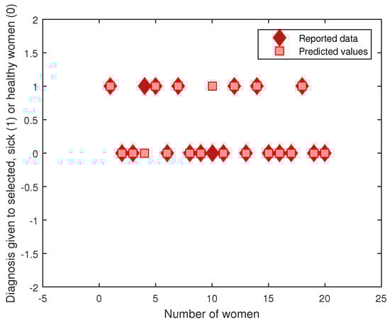 Figure 4 shows the evaluation of the learning performed for the T-S rule base and the premises with the centroids of the FCM algorithm. The 20 sample datasets selected contained 7 cases with hypertension versus 13 healthy cases; for these, there were two prediction errors.