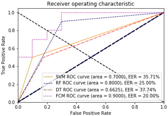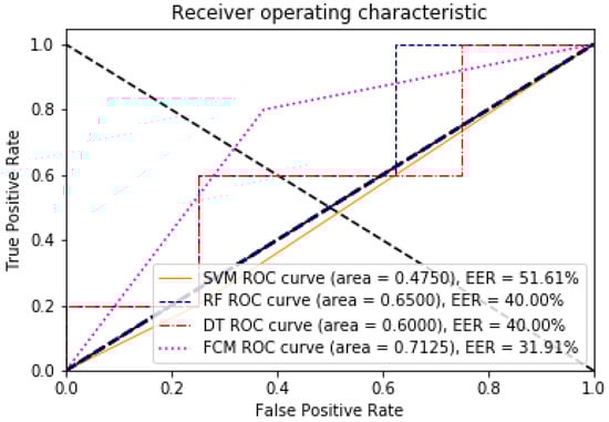 The point on the ROC curve that corresponds to the EER has an equal probability of wrongly classifying a positive or negative sample. This point is obtained by intersecting the ROC curve with a diagonal of the unit square [40]. A comparative analysis of the ROC and EER curves was performed to evaluate the performance of the models with and without dimensionality reduction. The evaluation of the algorithms with respect to these two measures can be seen in Figure 5 and Figure 6, for 85 features against the 8 found through the data discriminant; the improvement of the algorithms in their learning is remarkable.