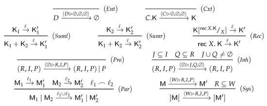 The process has no transition. The rule makes available the entities in the (possibly empty) set D, then reduces to ∅. The rule says that a prefixed context process makes available the entities in the set C and then reduces to . The rule is the classical rule for recursion. The rules and select a move of either the left or the right component, resp., discarding the other process. The rule executes the reaction (its reactants, inhibitors, and products are recorded in the label), which remains available at the next step together with newly produced entities P. The rule applies when the reaction should not be executed; its label records the causes for which the reaction is disabled: possibly some inhibiting entities are present or some reactants are missing, with , as at least one cause is needed. The rule puts two processes in parallel by pooling their labels and joining all the set components of the labels. The sanity check is required to guarantee that reactants and inhibitors are consistent.
