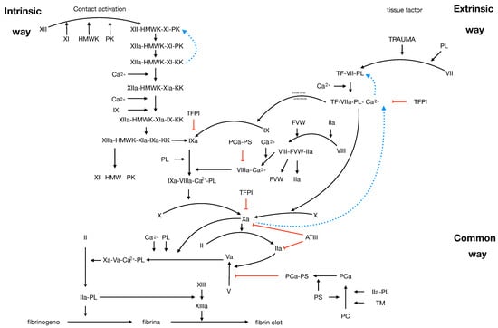 The factors are named with a Roman numeral from I to XIII according to the international nomenclature, indicating the order of discovery rather than activation, while the addition of “a” at the end of the numeral indicates the activation of that factor by another factor in the cascade. The nomenclature has an exception in prekallikrein (PK) and high molecular weight kininogen (HMWK). Other fundamental components for the coagulation process are phospholipids (PL), which constitute an appropriate reaction surface, and calcium ions, which promote interactions between enzymes, cofactors, and phospholipids.