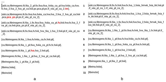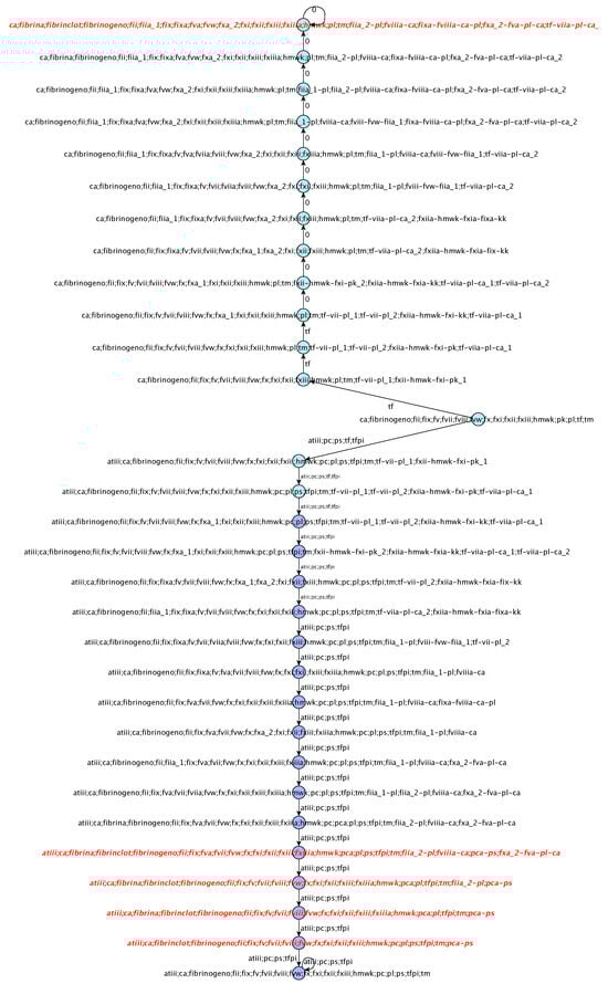 We can notice that in the sliced trace (a) in the first row, the entity thrombomodulin (TM) appears, whereas in the sliced trace (b), it does not, although in both cases we are recording the causes of the fibrin clot. This is due to the fact that the formation of the fibrin clot in sliced trace in (a) occurs after the inhibitor PCa-PS has been activated by TM, Rows 1–2. Furthermore, PCa-PS has acted by blocking the factor V, Row 3, which has been reactivated, Row 7. This dynamics explains the presence of the entity TM in the sliced trace (a).