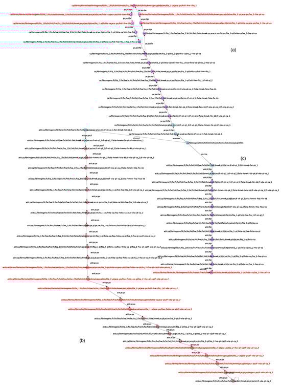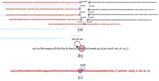 Figure 10. The three attractors of the graph in Figure 9: the attractor in (a) corresponds to the presence of inhibitors pc and tfpi; the attractor in (b) corresponds to the presence of inhibitors pc and atiii; and the attractor in (c) corresponds to the presence of inhibitors tfpi and atiii. - Removal of antithrombin (with protein C, protein S, and TFPI present).Despite the presence of protein C, protein S, and TFPI, the removal of antithrombin leads to a cycle in the coagulation system, evidenced by the persistence of factors Xa, IIa, VIIIa, (VIIIa-FVW-IIa), as depicted in Figure 9a and Figure 10a. Uncontrolled activation of factor Xa and thrombin promotes continuous activation of factors VIIIa. This process fosters excessive coagulation, leading to the formation of a fibrin clot resistant to degradation by the fibrinolysis mechanism and shows the importance of antithrombin in balancing coagulation and fibrinolysis and the additional risk of thrombosis associated with its deficiency. Antithrombin is crucial in protecting against excessive coagulation []. Low levels of antithrombin increase the risk of thromboembolism, while excessively high levels do not appear to cause bleeding or have clinical significance.