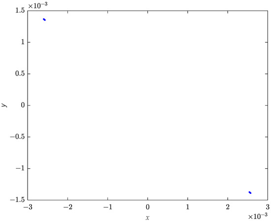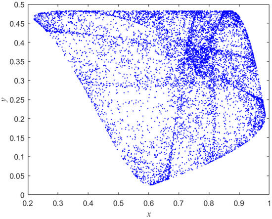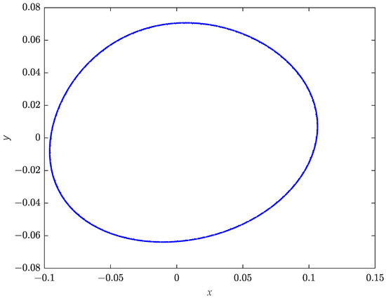 When , changes from to . Figure 1 is the bifurcation diagram, showing the output of component with respect to , with initial state . After a simple calculation, there is a Naimark–Sacker bifurcation at the fixed point (0, 0), when . The phase portrait of an invariant circle for is shown in Figure 2.