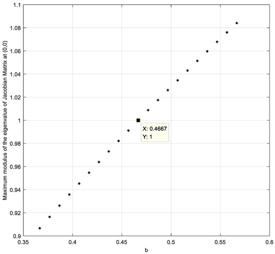 When , Figure 3 lists the maximum modulus of the eigenvalues of Jacobian Matrix at with respect to , with the initial state . When , . From Figure 3, if , the maximum modulus of the eigenvalues of the Jacobian matrix at are all less than one, and if , the maximum modulus of the eigenvalues of Jacobian matrix at are all larger than one. Thus, there is a transcritical bifurcation for , , just as Figure 4 shows.