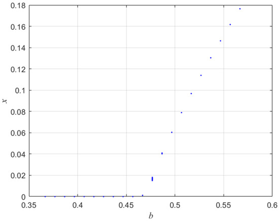 Since , and , in discrete dynamical system (1), thus, . Let ; we consider the parameter as an independent variable; then, the discrete dynamical system (1) becomes