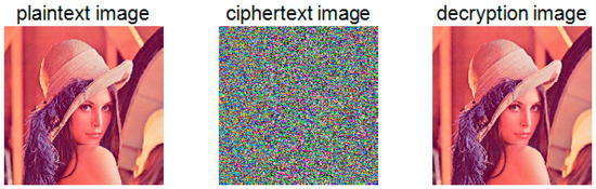 In order to verify the good encryption effect of the proposed system (1), several simulation experiments on the image encryption with ‘Lena’ are carried out in this section. The information entropy of the encrypted images with the different two-dimensional discrete systems [14,20,28] is listed in Table 1. It indicates that the encrypted image with the proposed system (1) is close to eight; this means that the encrypted image with the proposed system (1) has a good random distribution. The number of pixel changing rate (NPCR) and the unified averaged changed intensity (UACI) are listed in Table 2 to measure the sensitivity of the encryption to plaintext. From Table 2, NPCR and UACI in the proposed system (1) are a little more than the other contrast systems. These results show that the encryption security performance of the proposed system (1) is a bit more effective than the other contrast systems. Thus, the proposed system (1) has an advantage in image encryption.