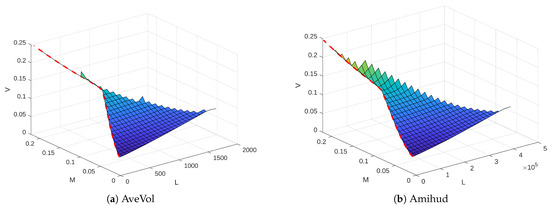 Figure 3 and Figure 4 show the efficient frontiers obtained with the MV-L model for the different liquidity measures employed; in detail, Figure 3 displays the 3D surfaces as the target return M and the target liquidity L vary, and Figure 4 displays the level curves. In both figures, the minimum level considered for the liquidity measures is set to the liquidity value exhibited by the minimum variance optimal portfolio. For comparison, Figure 3 also shows the mean variance frontier obtained with the MV model (7), indicated with a red dashed line; the minimum variance portfolio exhibits a volatility and a return equal to . As can be seen, the model proposed allows us to smoothly compute the efficient frontiers with all the four liquidity measures considered.