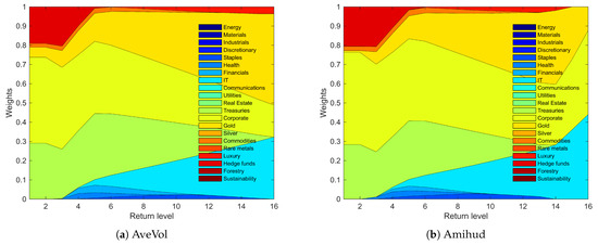 As can be expected, it is now possible to build portfolios with an extremely high target return, at the cost of a high risk and also a low liquidity, as seen in Figure 11. However, the introduction of a liquidity constraint impedes obtaining portfolios with the most extreme return values. In particular, the KO liquidity measure substantially limits the return that can be obtained from the portfolio, much more than the other three liquidity measures. On the other hand, we may notice that the Bitcoin ETF enters all the optimal portfolios for the highest target return levels, while the share allocated to the Information Technology (IT) ETF is sensibly reduced (Figure 13) when the liquidity dimension is taken into account. Similarly to the case without Bitcoin (see Section 4.1), the MV-L model assigns a relevant weight to the most liquid ETFs—based on the liquidity measure selected—to satisfy the liquidity goal. However, it is interesting to note that, except for the KO, requiring a higher liquidity has the consequences of increasing the portion allocated to the most liquid ETFs and, jointly, switching the position from the IT ETF in favor of the more profitable Bitcoin ETF. Hence, overall, we observe that the logic behind the MV-L optimization model—that is, balancing the liquidity goal with the risk and return ones—has not changed. However, the specific risk–return characteristics of the Bitcoin ETF lead to different portfolio compositions compared to the ones obtained when this asset is excluded from the investable alternatives.