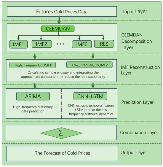 For the task of non-stationary, stochastically complex financial time series prediction, we selected the gold futures prices as the prediction object because they have always played a crucial role in the global economy and finance, and we also proposed a method that combines statistical learning and deep learning to predict the sequences based on the decomposition and reconstruction method using CEEMDAN-SE. This algorithm first decomposes the raw data into a series of IMFs, significantly reducing nonlinearity and non-stationarity, and then calculates the sample entropy values of each IMF. To reduce computational complexity, the sequences with similar entropy values are integrated into the low-frequency and high-frequency components. For the high-frequency components, the ARIMA model was selected, and for the low-frequency components, the CNN-LSTM model was chosen. To enhance the practicality and scalability of the model presented in this paper, future studies could consider expanding the range of experimental prediction targets, such as crude oil prices and international natural gas prices. Another focal point of research in this area is feature selection for the prediction targets, including average daily prices, average opening prices, average closing prices, average highest and lowest prices, daily trading volumes, and economic technical trading indicators. The selection of different features is also of great importance for predicting final prices [39].