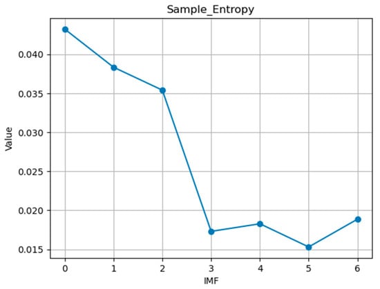 According to the information in the figure, the ranges of sample entropy values for IMF1-IMF3 are similar, with the sample entropy values for the first three components fluctuating between 0.0307 and 0.0328. For the last four components, IMF4-IMF7, the sample entropy values range between 0.0193 and 0.0223. The sample entropy of each component is shown in Figure 5.