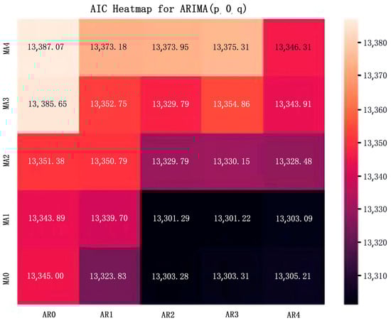 Finally, the parameters of the ARIMA model were determined to be (3, 0, 1) according to the heat map of the Akaike information value, and this heat map is shown below (Figure 8).