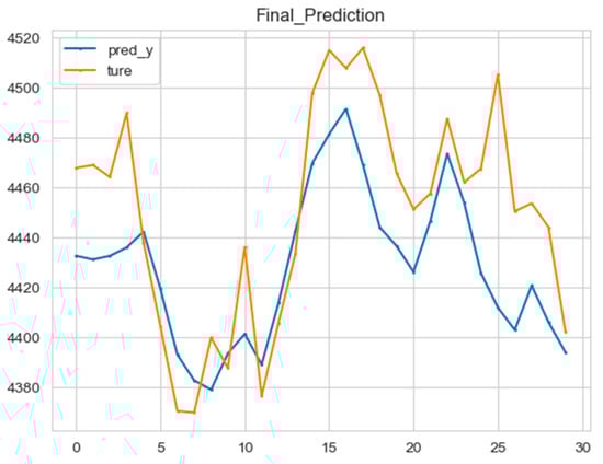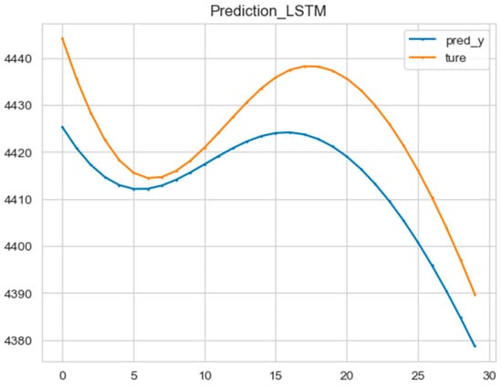 First, the historical dynamic data of Co-IMF2 were normalized using the MinMaxScaler function. Then, the original 1200 data points were divided into a training set and a validation set in a ratio of 8:2. The network structure parameters were defined as follows: the one-dimensional convolutional filter was set to be 32, kernel_size was set to be 2, and the activation was set to be sigmoid. The input dimension of the LSTM was 1, the hidden state dimension was 64, the number of LSTM layers was 5, and the training period was set to 500, with 64 data points per training batch. The Adam optimizer was used, with a learning rate of 0.001. The prediction results are shown in the following figure (Figure 10).