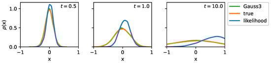 with respect to the system learned by the likelihood and the quadrature based model. It can be seen that the three-point Gaussian quadrature-based model produces good estimates of the PDFs for both small and large time points