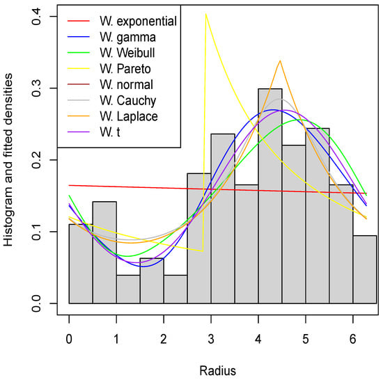In this section, we review wrapped Akash, wrapped Aradhana, wrapped binormal, wrapped Birnbaum–Saunders, wrapped Cauchy, wrapped chi-square, wrapped exponential, wrapped exponentiated inverted Weibull, wrapped gamma, wrapped generalized geometric stable, wrapped generalized Gompertz, wrapped generalized normal Laplace, wrapped generalized skew normal [10], wrapped generalized skew normal [11], wrapped half-logistic, wrapped half-normal, wrapped [12]’s skew Laplace, wrapped hypoexponential, wrapped Ishita, wrapped Laplace, wrapped length-biased weighted exponential, wrapped Levy, wrapped Lindley, wrapped Linnik, wrapped Lomax, wrapped modified Lindley, wrapped new Weibull–Pareto, wrapped normal, wrapped Pareto, wrapped quasi-Lindley, wrapped Rama, wrapped Richard, wrapped Shanker, wrapped skew Laplace, wrapped skew normal, wrapped stable, wrapped Student’s t, wrapped transmuted exponential, wrapped two-parameter Lindley, wrapped two-sided Lindley, wrapped variance gamma, wrapped weighted exponential, wrapped Weibull, wrapped XGamma and wrapped XLindley distributions.