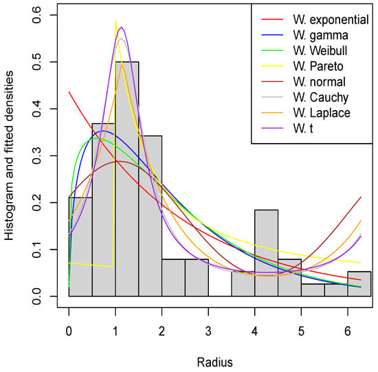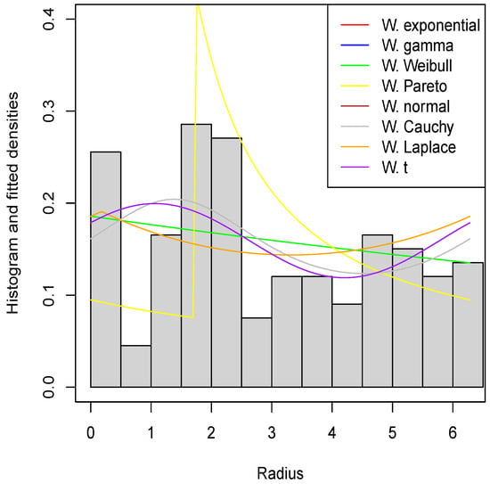 respectively, where . The wrapped exponential inverted Weibull distribution was used to analyze the orientation data of 76 turtles post egg-laying, as documented by [1]. This distribution exhibited a superior fit compared to the wrapped new Weibull–Pareto distribution. Nonetheless, a limitation is noted due to the absence of a closed-form PDF.