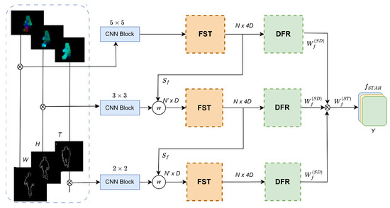 As shown in Figure 1, the term N denotes the number of feature maps or channels at a particular stage. After it is processed through the CNN block, the dimension of the feature vector is represented by D. The feature set after transformation is indicated by . Additionally, and are the weights applied to spatial-domain features and spatio-temporal features, respectively. These terms are integral to understanding the data flow and operations within the multi-head attention mechanism, and they are clarified in the relevant sections of the manuscript to enhance the comprehension of the diagram.