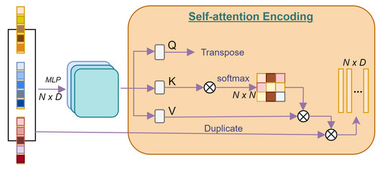 As shown in Figure 3, our temporal attention-encoding scheme exhibits a structural resemblance to the foundational NLP Transformer encoder, as proposed by Vaswani et al. [42], with the exception of the positional embedding component. This deviation arose due to the inherent inclusion of position information within the point features themselves, thus obviating the need for an additional positional embedding mechanism. Readers can refer to [42,43,44] for more details. represents the computation involved in the temporal-attention mechanism for channel-wise feature extraction.