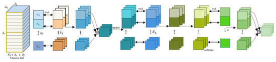 Here, represents the reweighted feature vector for the temporal attention head, specifically aimed at capturing spatial information across each channel. This reweighting process involves several steps: Firstly, the query embedding is multiplied by the transpose of the key embeddings , producing a matrix product that iteratively spreads spatial information across each channel. Subsequently, the resulting matrix is multiplied element-wise (⊙) with the transpose of the key embeddings , enhancing the importance of spatial information in the feature reweighting process. The resulting matrix is then scaled by a factor of and normalized by to control the magnitude of the feature reweighting. Finally, the sigmoid activation function is applied to ensure the non-linearity and boundedness of the reweighted features, while represents a scaling factor applied element-wise across the resulting matrix. Overall, this process yields a reweighted feature vector that emphasizes spatial information across each channel, facilitating effective feature extraction and representation in the context of temporal attention mechanisms. The result of the linear transformation is passed through a softmax function to normalize the attention scores. The final output is a weighted sum of the input features, adjusted according to the learned attention weights. Similar to queries and keys, values () are calculated for each head. These values are multiplied by the attention scores and summed up to produce the final output for each head. To amalgamate their attributes, we propose a spatial–temporal re-weighting scheme, as detailed below.