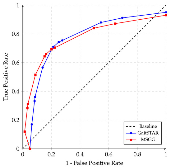 ROC curves for two models. The black dashed line represents the baseline performance of a random classifier. The blue curve represents the ROC curve for Model 1 (GaitSTAR), and the red curve represents the ROC curve for Model 2 (MSGG).