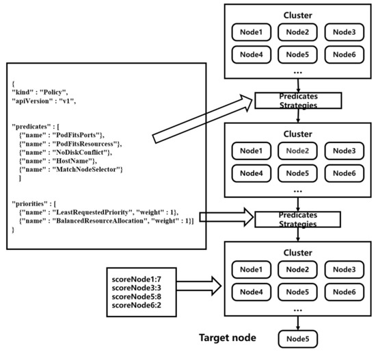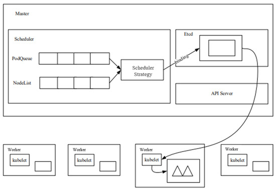 The Kubernetes cluster implements the scheduling of Pod applications through the component Kube-scheduler. First, the Kube-scheduler binds the Pod application to be scheduled to the most appropriate node in the cluster according to Kubernetes’ default (and customisable) scheduling policy, after going through the appropriate preselection and preference phases. Metadata about bindings (including node and Pod applications) are stored in Kubernetes’ ETCD database. The Kubernetes resource scheduling model is shown in Figure 2. We briefly present the execution process of the Kubernetes cluster scheduler, as follows: