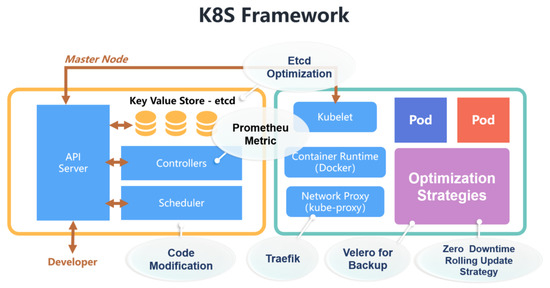 Docker works with packaging applications and their dependencies. The containerization scheme employed by Docker allows for the creation of multiple containers using a single image and a shared operating system [3,6,7]. Docker itself cannot automatically schedule and scale containers, a container management system is needed to maximize the capabilities and benefits of containers, and Kubernetes is one of the most iconic of these systems. Kubernetes, K8s in short, is used for managing containers and it is most widely used [3,8,9,10]. Kubernetes, built on container technology, provides simple functions such as resource scheduling, service discovery, high availability management, and elastic scaling for cross-host containerized applications. It provides improved management tools to support development, deployment, operation monitoring, etc. It can realize application development, automatic management of multiplatform transplantation, and other functions. However, we observe that Kubernetes has several areas that need improvement, especially, the performance of native components of Kubernetes cannot cope with complex application requirements, e.g., large-scale services and applications in cloud computing, edge computing, and many others. As stated earlier, Kubernetes with default components and settings encounter issues, such as high data distribution latency [11,12], inefficiency in cluster backup and restore leading to poor disaster recovery [13,14], poor rolling update leading to downtime [15,16,17], inefficiency in load balancing and handling requests [18], poor autoscaling [10,19] and scheduling strategy [20,21,22,23] leading to quality of service (QoS) violations and insufficient resource usage, and many others. To this end, in this study, our goal is to enhance cloud computing systems and services while optimizing Kubernetes. With Kubernetes toward enhancing cloud computing services, the biggest challenge is to choose better-performing components while replacing native components and using appropriate methods to optimize. Our plan is to select different components for testing and perform comparative analysis, modify the underlying architecture at the same time, and finally verify the results through detailed experiments. To this end, we focus on improving the performance of K8s cloud computing by using new components and modifying K8s architecture. In essence, we explore the following areas in great detail: